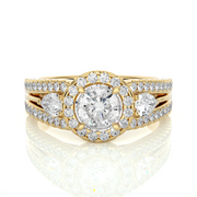 1.43 CT Round Center with Pear & Round Side Lab Grown Diamond Halo Ring | Split Shank, 83 Stone Gold Band