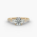 Set in timeless yellow, white, or rose gold (available in 10K, 14K, or 18K), the classic three-stone silhouette is elevated with a shimmering row of fine accents along the band, combining traditional symbolism with modern brilliance.